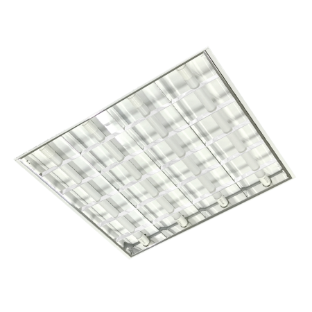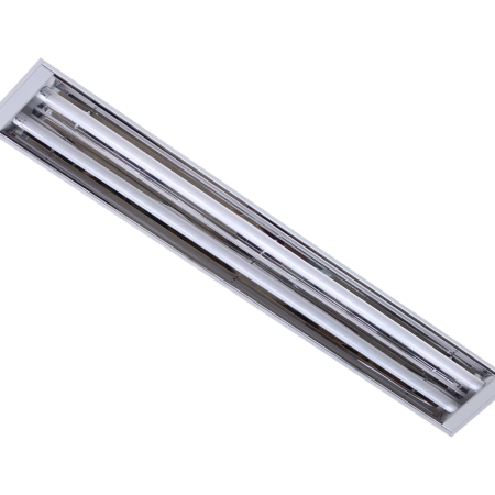Luminária industrial de sobrepor ou pendente. Corpo e refletor em chapa de aço tratada isenta de ondulação. Pintura eletrostática epóxi na cor branca. Soquetes T8 em policarbonato anti-vibratório de engate rápido.