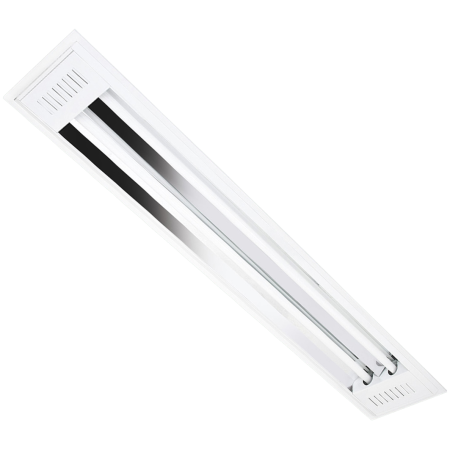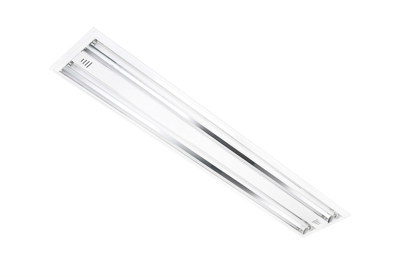 Luminária de embutir em forro de gesso ou modulado. Corpo em chapa de aço tratada isenta de ondulação. Pintura eletrostática epóxi na cor branca. Refletores em alumínio de alto brilho e refletância. Soquetes T5 em policarbonato anti-vibratório de engate rápido.