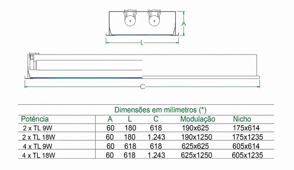 de ondulação. Pintura eletrostática epóxi na cor branca. Difusor em PS translúcido. Soquetes