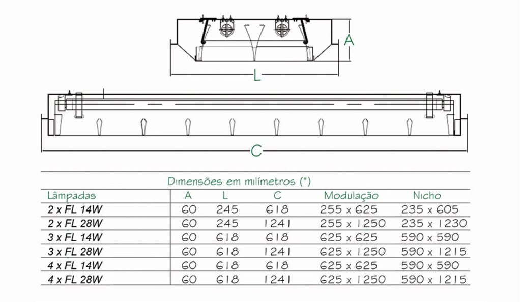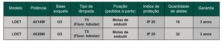 Luminária de embutir em forro de gesso ou modulado. Corpo em chapa de aço tratada isenta de ondulação. Pintura eletrostática epóxi na cor branca. Refletores e aletas parabólicas em