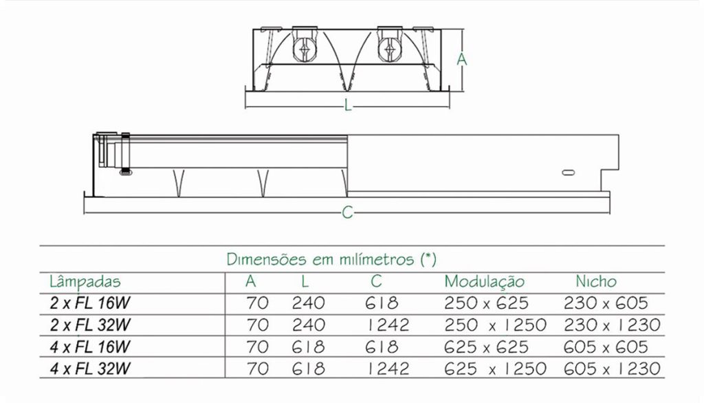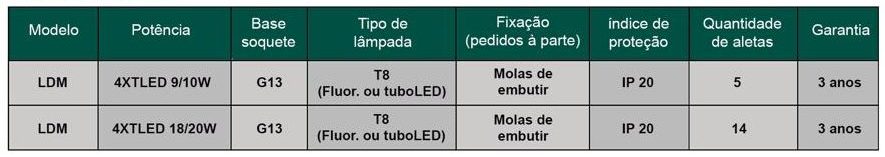 Luminária de embutir em forro de gesso ou modulado. Corpo e aletas planas em chapa de aço tratada isenta de ondulação. Pintura eletrostática epóxi na cor branca. Refletores parabólicos em alumínio de alto brilho e refletância. Soquetes T8 em policarbonato anti-vibratório de engate rápido.