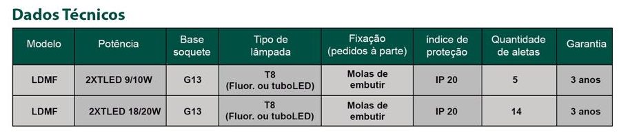 Luminária de embutir em forro de gesso ou modulado. Corpo e aletas planas em chapa de aço tratada isenta de ondulação. Pintura eletrostática epóxi na cor branca. Refletores parabólicos em alumínio de alto brilho e refletância. Soquetes T8 em policarbonato anti-vibratório de engate rápido.