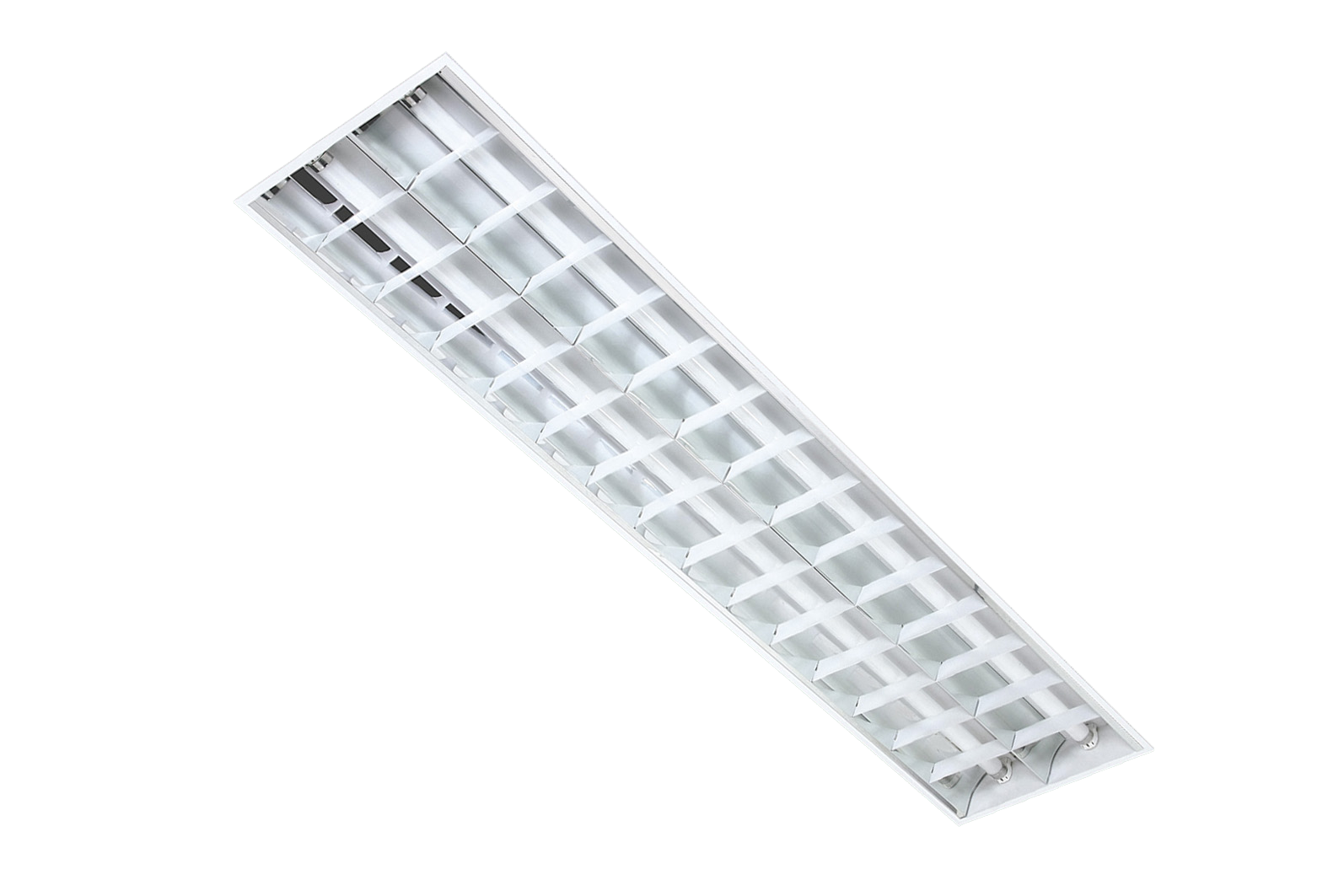 Luminária de embutir em forro de gesso ou modulado. Corpo e aletas planas em chapa de aço tratada isenta de ondulação. Pintura eletrostática epóxi na cor branca. Refletores parabólicos em alumínio de alto brilho e refletância. Soquetes T8 em policarbonato anti-vibratório de engate rápido.