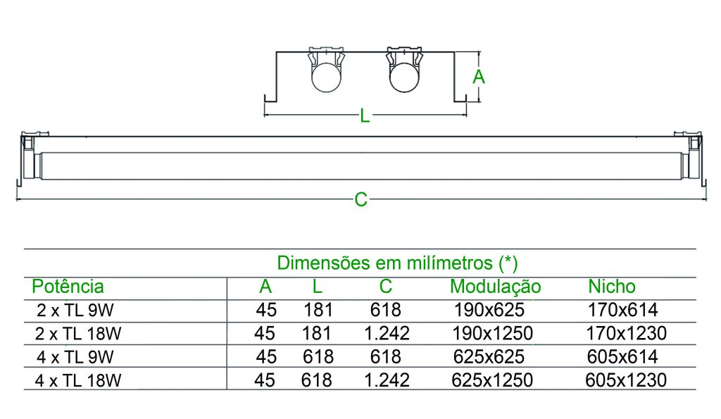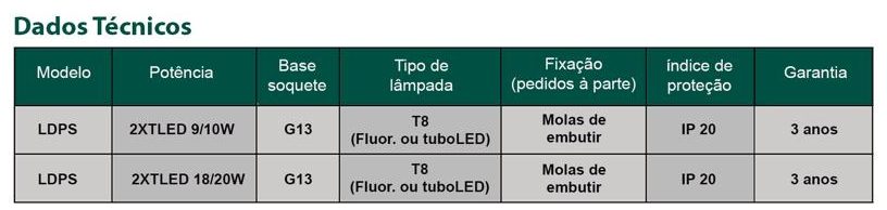 Luminária de embutir em forro de gesso ou modulado. Corpo em chapa de aço tratada isenta de ondulação. Pintura eletrostática epóxi na cor branca. Soquetes T8 em policarbonato anti-vibratório de engate rápido.
