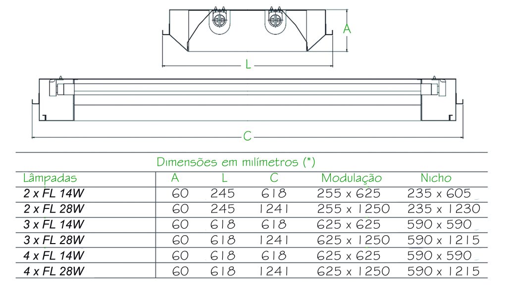 Luminária de embutir em forro de gesso ou modulado. Corpo e cobre soquetes em chapa de aço tratada isenta de ondulação. Pintura eletrostática epóxi na cor branca. Refletor em alumínio de alto brilho e refletância. Soquetes T5 em policarbonato anti-vibratório de engate