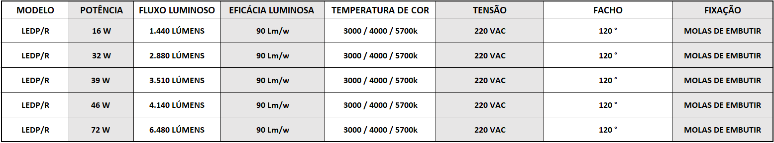 Luminária retangular de embutir em forro de gesso ou modulado. Corpo em chapa de aço tratada isenta de ondulação. Pintura eletrostática epóxi na cor branca. Difusor em PS translúcido. LEDs SMD de alto desempenho aplicados sobre placa de circuito impresso. Driver multitensão com alto fator de potência e baixo THD.