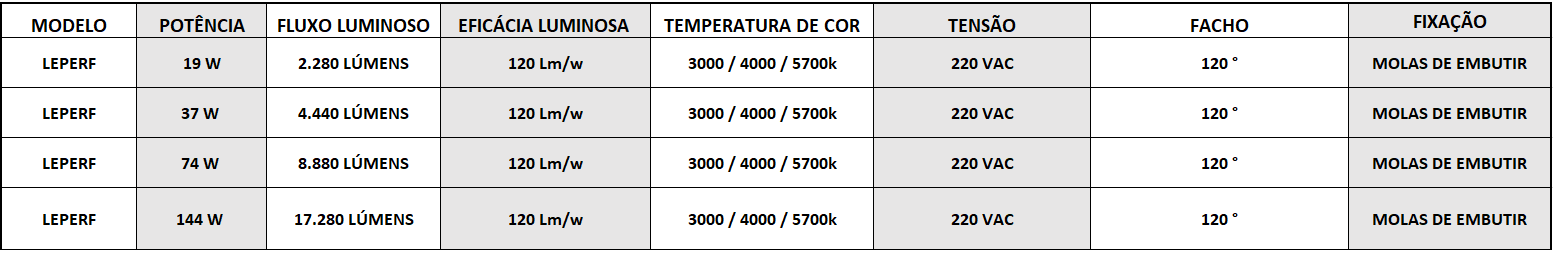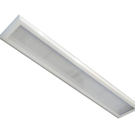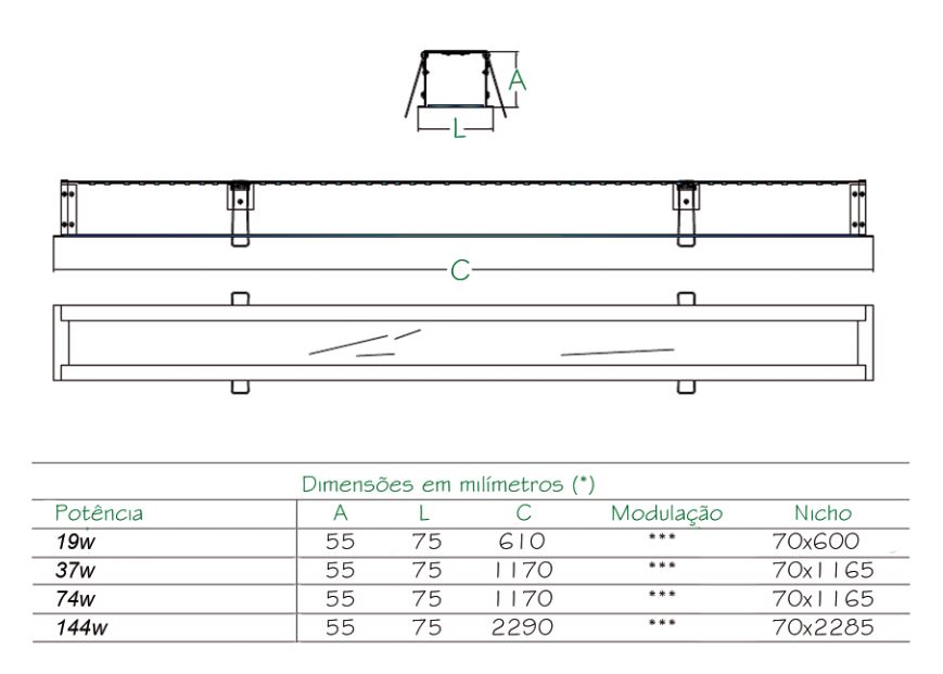 Luminária linear de embutir em forro de gesso ou modulado. Corpo em chapa de aço tratada isenta de ondulação. Pintura eletrostática epóxi na cor branca. Difusor em PS translúcido. LEDs SMD de alto desempenho aplicados sobre placa de circuito impresso. Driver multitensão com alto fator de potência e baixo THD.