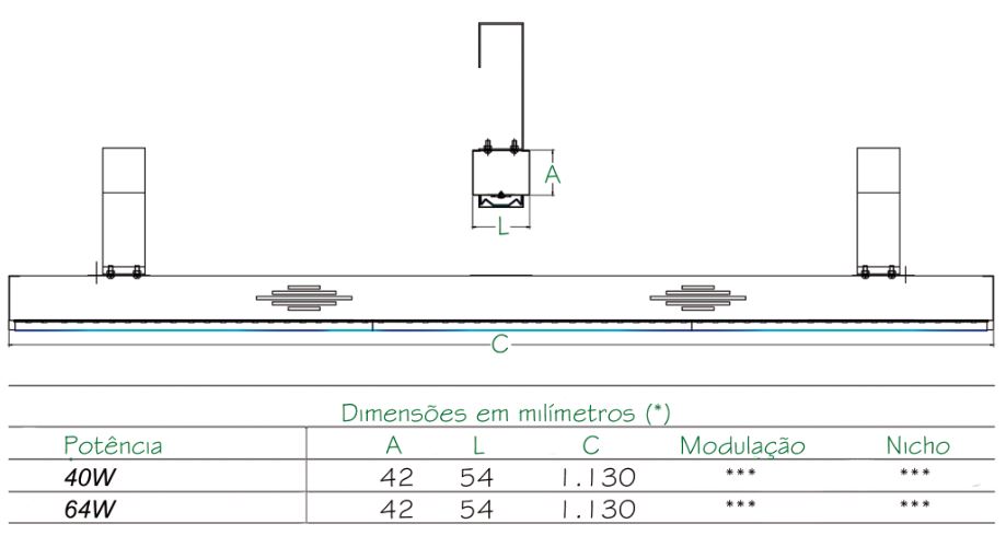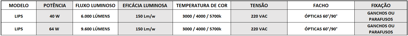 Luminária LED linear de sobrepor ou pendente. Corpo em chapa de aço tratada isenta de ondulação. Pintura eletrostática epóxi na cor branca. Lentes em PMMA com óptica ideal para iluminação de corredores de centros de distribuição. LEDs SMD de alto desempenho aplicados sobre placa de circuito impresso. Driver multitensão com alto fator de potência e baixo THD.
