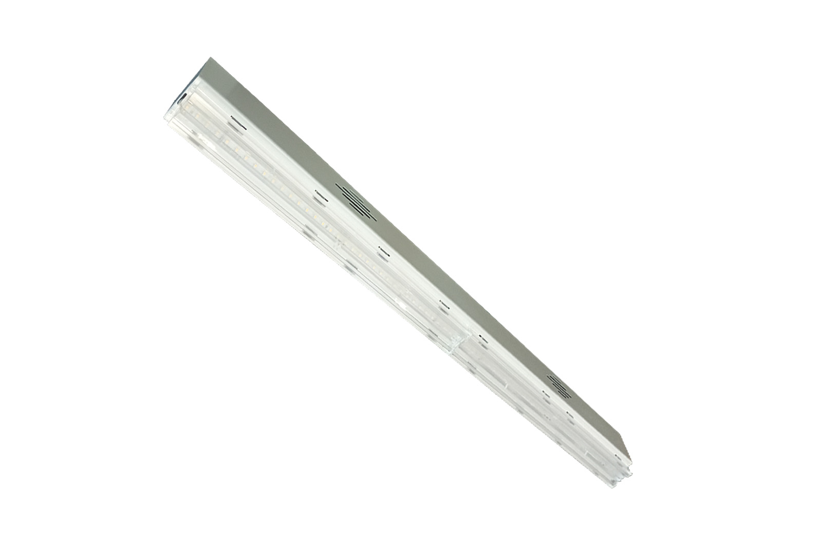 Luminária LED linear de sobrepor ou pendente. Corpo em chapa de aço tratada isenta de ondulação. Pintura eletrostática epóxi na cor branca. Lentes em PMMA com óptica ideal para iluminação de corredores de centros de distribuição. LEDs SMD de alto desempenho aplicados sobre placa de circuito impresso. Driver multitensão com alto fator de potência e baixo THD.
