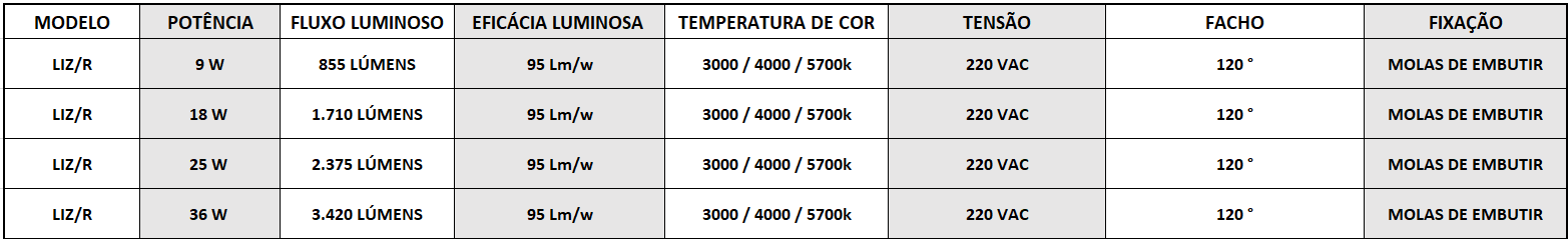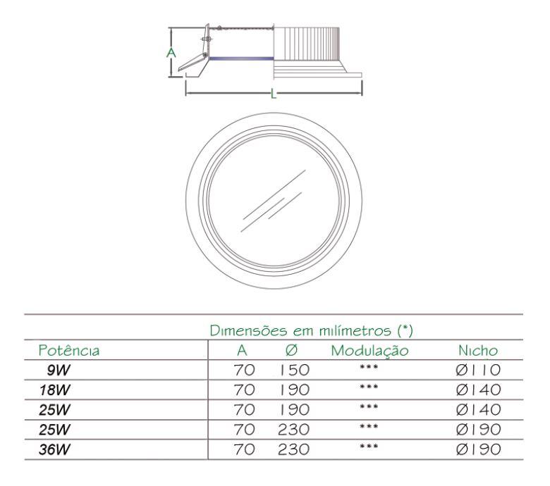 Luminária decorativa circular de embutir em forro de gesso. Corpo em alumínio repuxado. Pintura eletrostática epóxi na cor branca. Difusor em PS translúcido. LEDs SMD de alto desempenho aplicados sobre placa de circuito impresso. Driver multitensão com alto fator de potência e baixo THD.