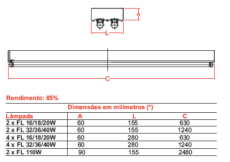 Luminária industrial de sobrepor ou pendente. Corpo em chapa de aço tratada isenta de ondulação. Pintura eletrostática epóxi na cor branca. Soquetes T8 em policarbonato antivibratório de engate rápido.