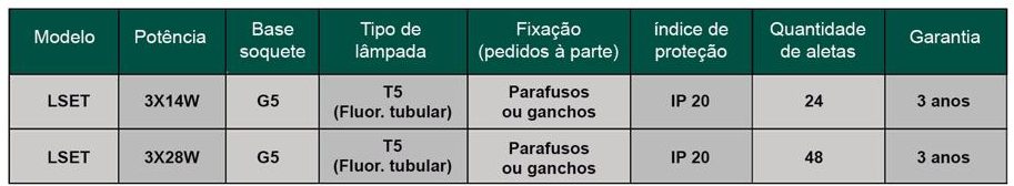 Luminária de sobrepor ou pendente. Corpo em chapa de aço tratada isenta de ondulação. Pintura eletrostática epóxi na cor branca. Refletores e aletas parabólicas em alumínio de alto brilho e refletância. Soquetes T5 em policarbonato anti-vibratório de engate rápido.