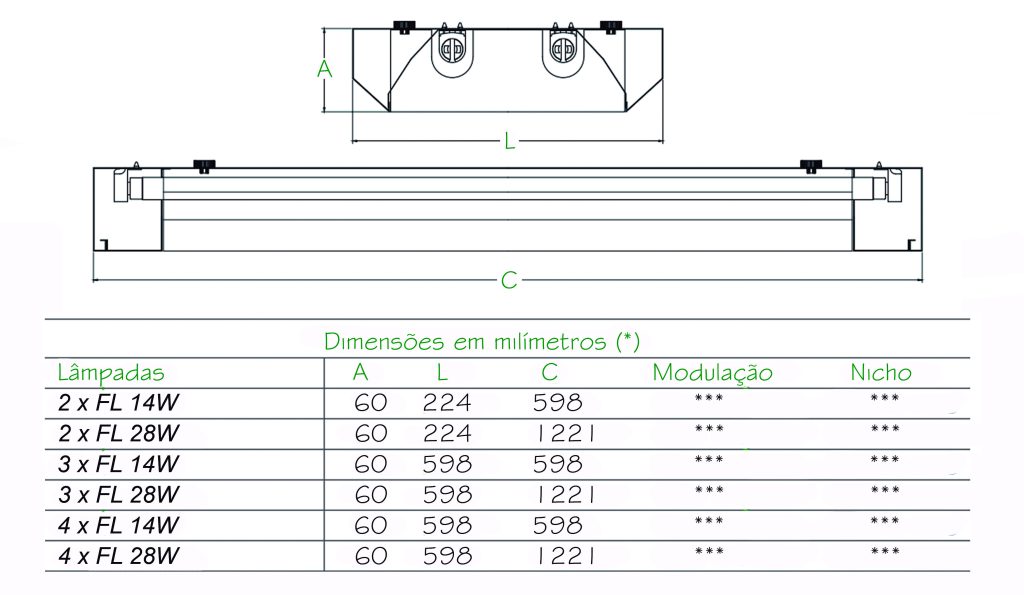 Luminária de sobrepor ou pendente. Corpo em chapa de aço tratada isenta de ondulação. Pintura eletrostática epóxi na cor branca. Soquetes T5 em policarbonato anti-vibratório de engate rápido.
