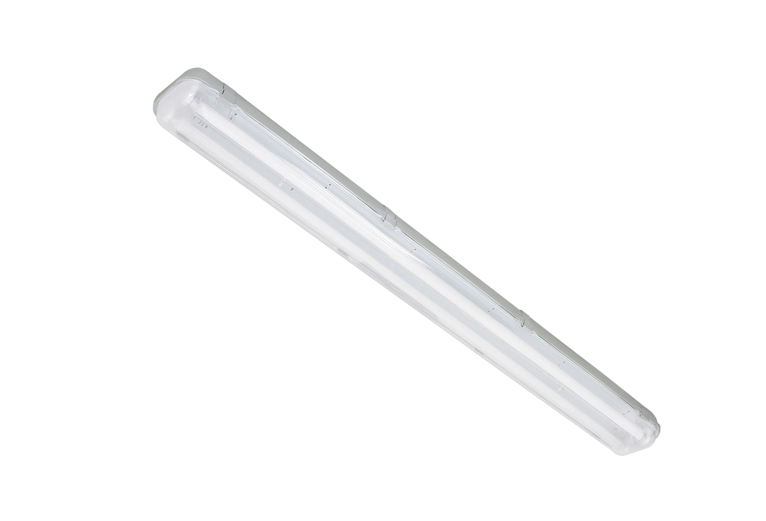 Luminária hermética de sobrepor. Corpo em policarbonato auto extinguível injetado. Refletor em chapa de aço tratada isenta de ondulação na cor branca. Presilhas em aço inoxidável.