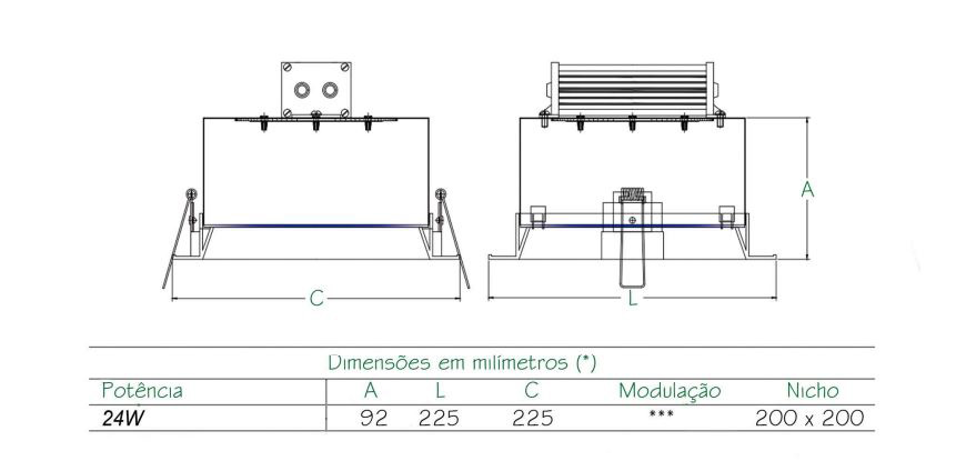 Luminária decorativa quadrada de embutir em forro de gesso. Corpo em chapa de aço tratada isenta de ondulação. Pintura eletrostática epóxi na cor branca. Moldura recuada em poliestireno injetado. Difusor em PS translúcido. LEDs SMD de alto desempenho aplicados