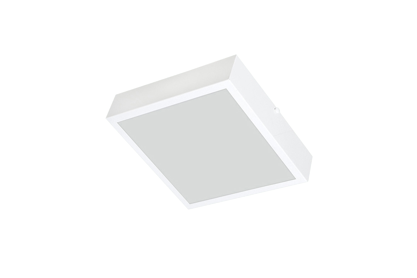 Luminária decorativa quadrada de sobrepor ou pendente. Corpo em chapa de aço tratada isenta de ondulação. Pintura eletrostática epóxi na cor branca. Difusor em PS translúcido. LEDs SMD de alto desempenho aplicados sobre placa de circuito impresso. Driver multitensão com alto fator de potência e baixo THD.